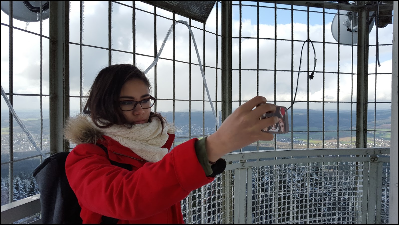Natürlich hatte ich wieder einmal selbst die kleine Nikon D3300 nicht dabei. So blieb bloß das Smartphone, in meinem Fall ein Samsung Galaxy S6. Auf dem Weg vom Parkplatz zum Turm hoch schoß ich damit die ersten Fotos, die auf dem Display allerdings nicht zu erkennen waren. Die Sonne stach zu sehr durch die aufgebrochene und eigentlich starke und dunkle Bewölkung vom Himmel und man erkannte einfach nichts auf dem recht großen Bildschirm.